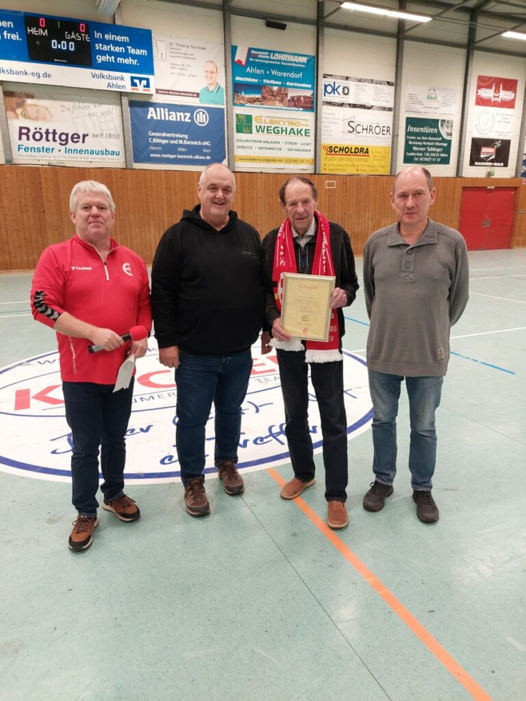 Besonders bemerkenswert ist, dass Horst Marke nicht nur treues Mitglied ist, sondern auch als einer der Gründungsmitglieder der Volleyballabteilung des Vereins eine herausragende Rolle spielte. Hiermit legte er mit den Grundstein für eine Abteilung, die heute bei vielen Vereinsmitgliedern beliebt ist. Ohne seinen Einsatz und Begeisterung für den Sport würde der Volleyballbereich heute sicherlich nicht dort stehen, wo er ist. Sein Einsatz für den Verein und den Volleyballsport verdient höchste Anerkennung. Die Ehrung selbst wurde vom ersten Vorsitzenden Frank Penger (2. von links) und dem Volleyballabteilungsleiter Bernhard Rittmeier (1. von rechts) vorgenommen.